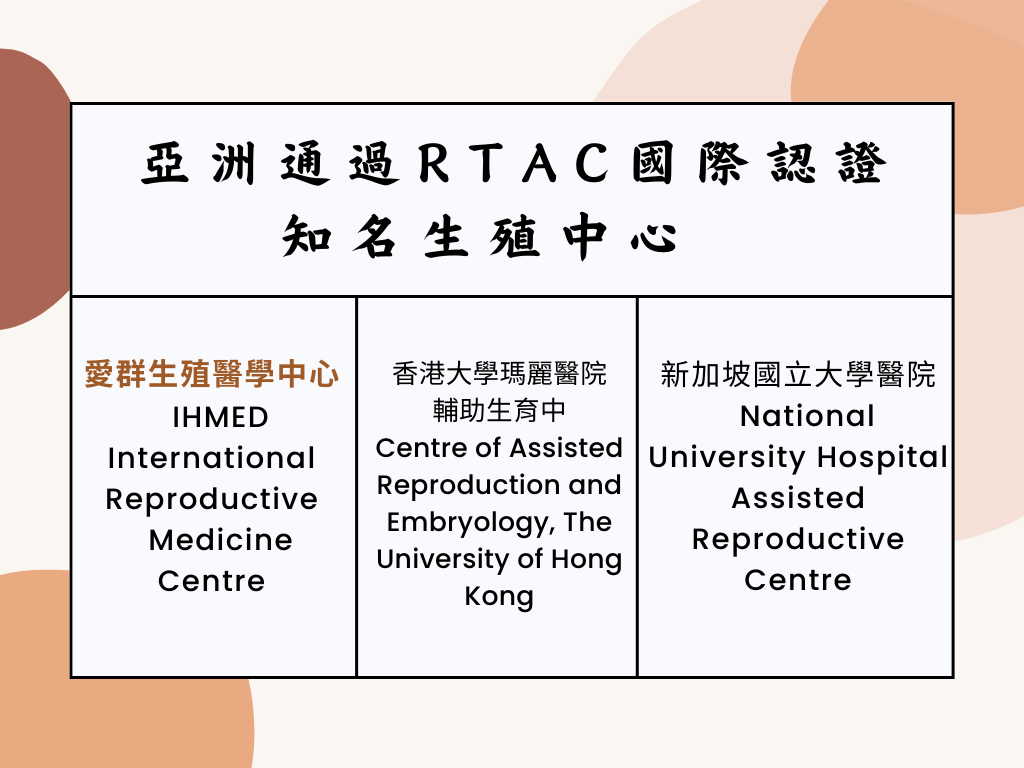 愛群通過與世界頂尖大學附設生殖中心同樣國際一流胚胎實驗室的等級認證,全亞洲僅37家生殖中心通過最具公信力的澳洲Reproductive Technology Accreditation Committee國際生殖醫學認證(簡稱RTAC認證)。在台灣,愛群是唯一通過RTAC認證的生殖醫學中心,提供病患最完善的醫療照護。