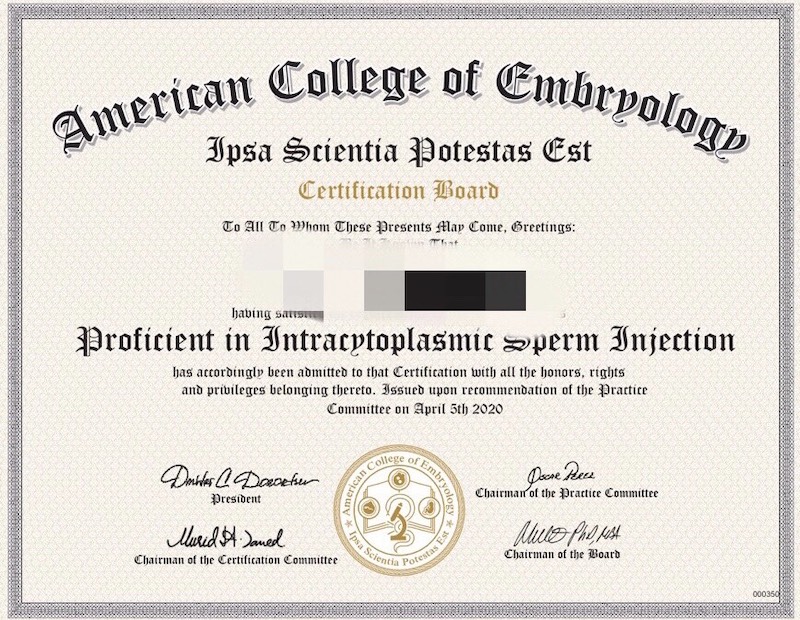 愛群胚胎師Holly榮獲美國EMBCOL(The American College of Embryology)針對 ICSI(單一精蟲顯微注射)精準熟練度的證書